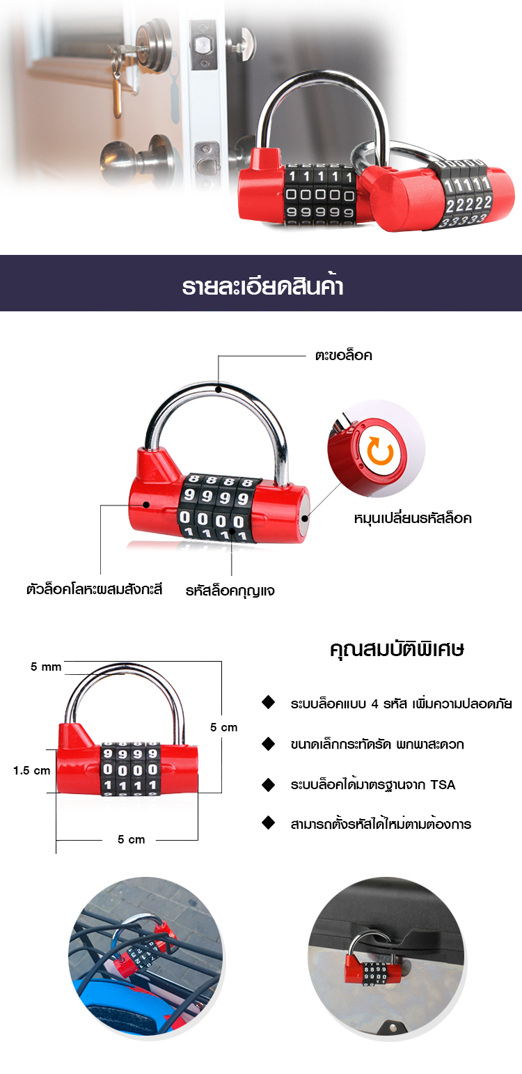 - รหัสปลดล็อคจากโรงงาน : 0000 (สามารถเปลี่ยนรหัสได้)