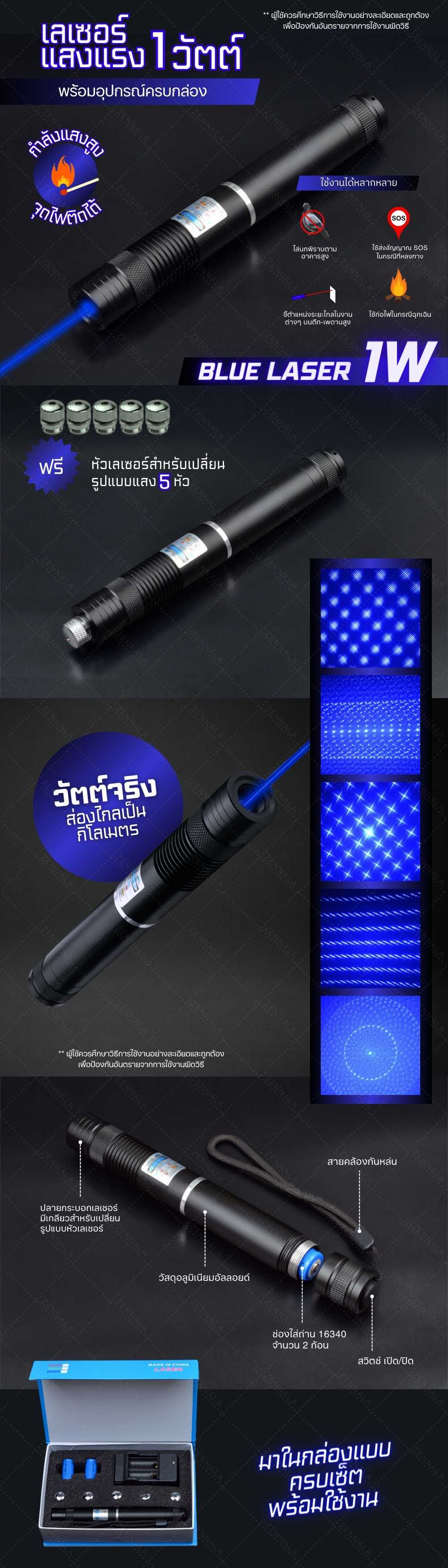 เลเซอร์น้ำเงิน ตัวนี้ยังมาพร้อมกับหัวแปลงลำแสง ที่สามารถเปลี่ยนตามใจชอบได้เลยถึง 5 แบบ