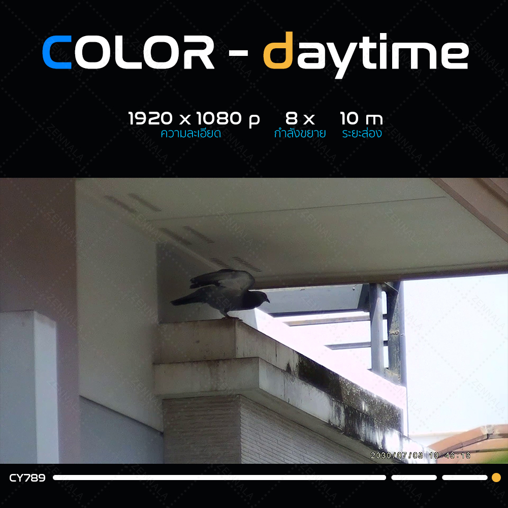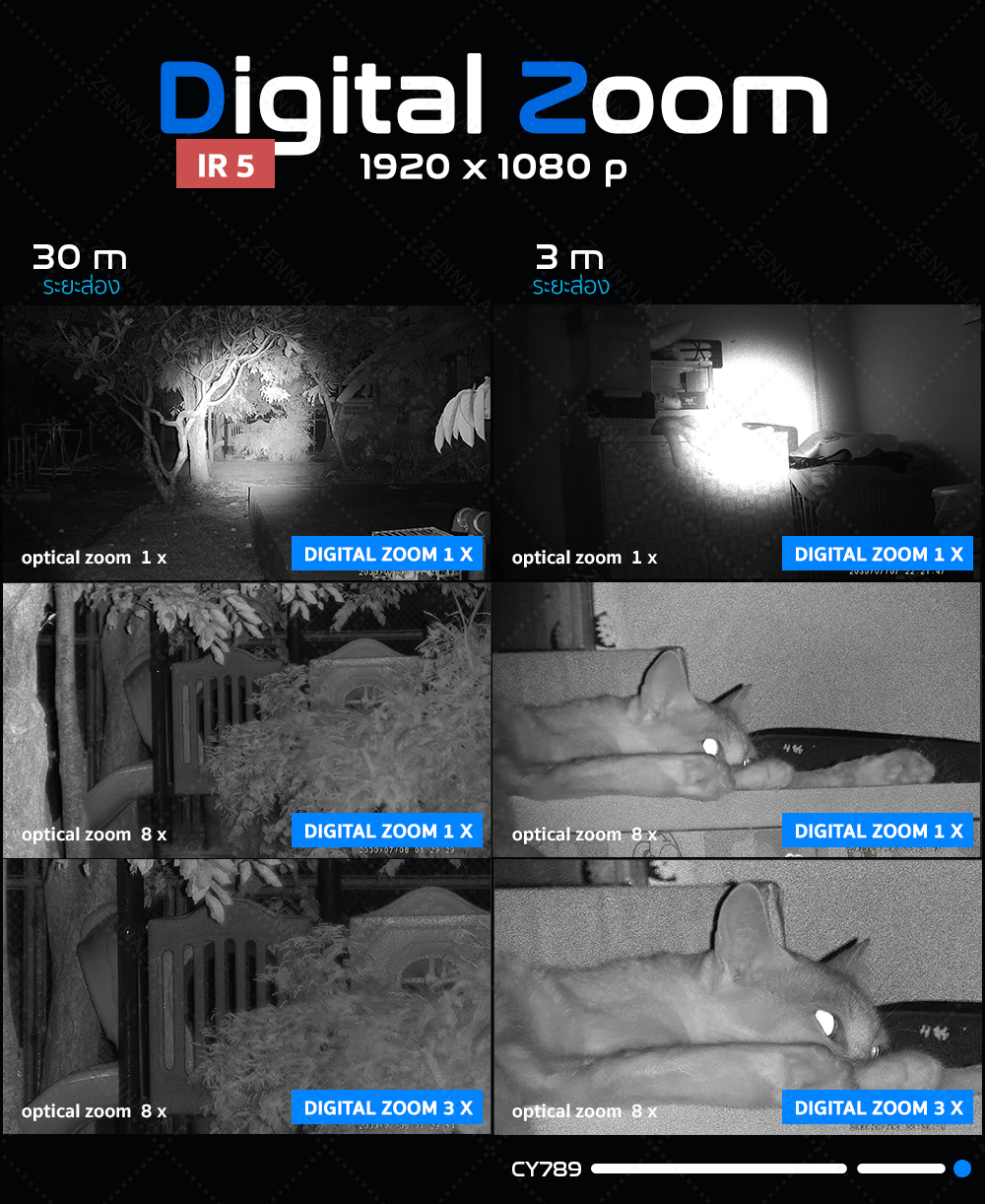 - ฟังก์ชันซูมดิจิทัล 3x ให้ภาพคมชัดแม้เป้าหมายอยู่ในระยะไกล ได้กำลังขยายสูงสุดที่ 24x