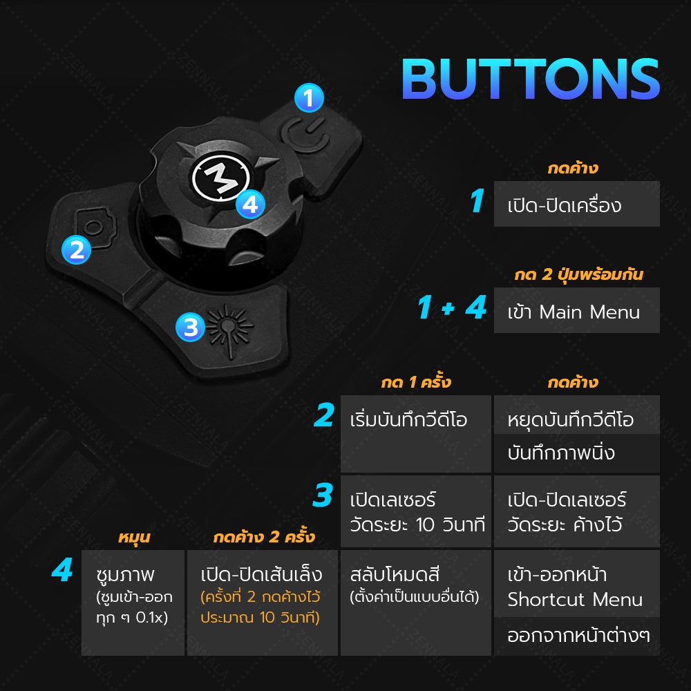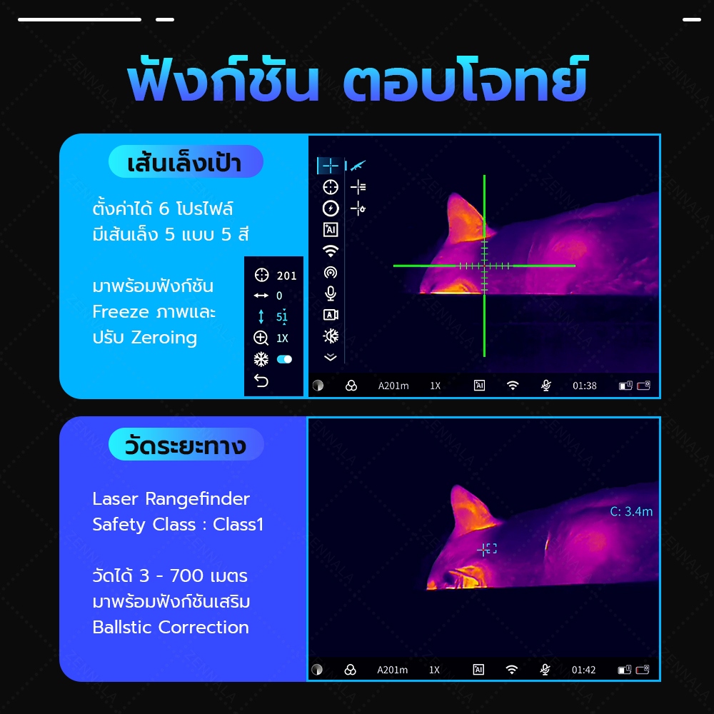 - ฟังก์ชั่นวัดระยะทางเลเซอร์ในตัว วัดได้สูงสุด 10 - 700 เมตร